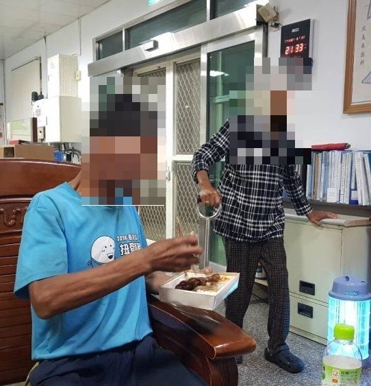 ▲失智男倒臥路旁警方將他帶回所內,並提供餐食供其溫飽。(圖/民雄分局提供)