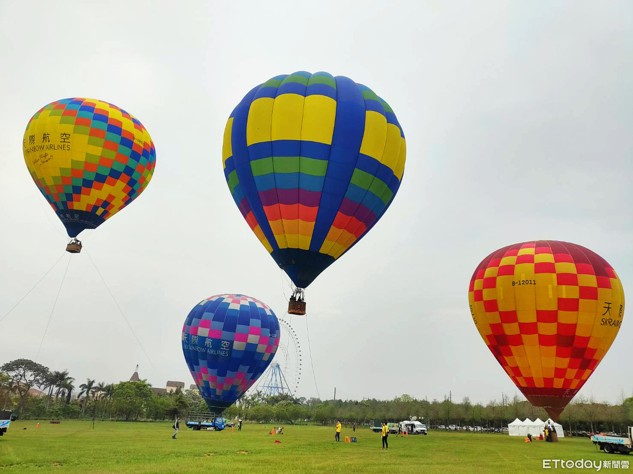 麗寶熱氣球夢想節1日舉辦試乘,操作人員在20公頃落羽松大草原準備將熱氣球充氣直立,日出後展開繫留升空,綠油油草原搭配彩色熱氣球,與後方天空之夢摩天輪、Outlet義大利風建築,讓人宛如置身國外。