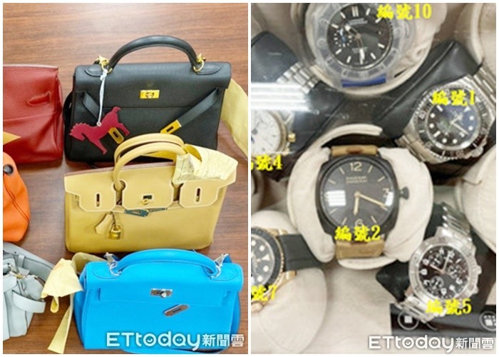 桃檢1日晚間將查扣證物公布,包括2支AP錶、6支勞力士、6支沛納海、4支OMEGA錶、4支愛馬仕,還有2支Franck Muller、2支崑崙表、1支ROUND WELL、1支BMW。另外還有6個HERMES、4個LV,10個CHANEL、FENDI、CELINE、BV、Gucci等名牌包包,總計難以估算,粗估市值應該逾2千萬元。
