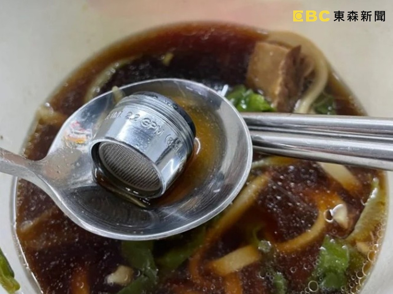 一名就讀師大的女大生日前在Dcard表示,她在連鎖餐飲店三商巧福點牛肉麵外帶,不料當她回到宿舍吃到一半(麵吃光),卻在湯中舀出一個水龍頭起泡器,氣得馬上衝到該店投訴。三商巧福表示,事件為特殊個案,對於消費者相當抱歉,後續除了予以賠償外,他們也會加強設備檢視及員工訓練。