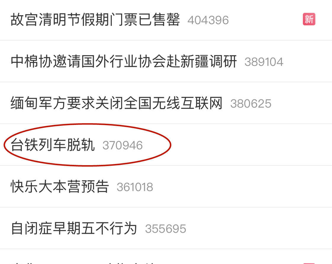 台鐵408次太魯閣號2日上午發生出軌事故,列車行經清水隧道時撞上滑落的工程車,目前已知共釀成36人死亡。據悉,大陸各方也相當關注台鐵出軌事件,媒體全部頭條滾動報導。「台鐵列車脫軌」登上微博熱搜,截止下午2點左右,已有1641萬閱讀量。