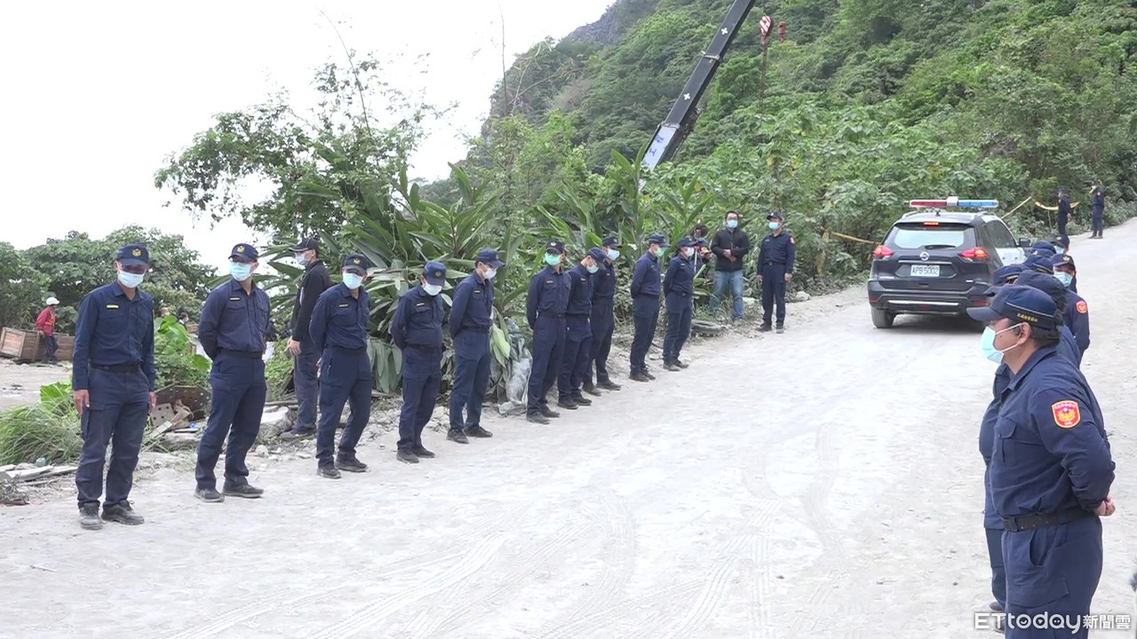 ▲太魯閣第6車廂移出,警方列隊向卡車內遺體致意。(圖/記者林振民攝)