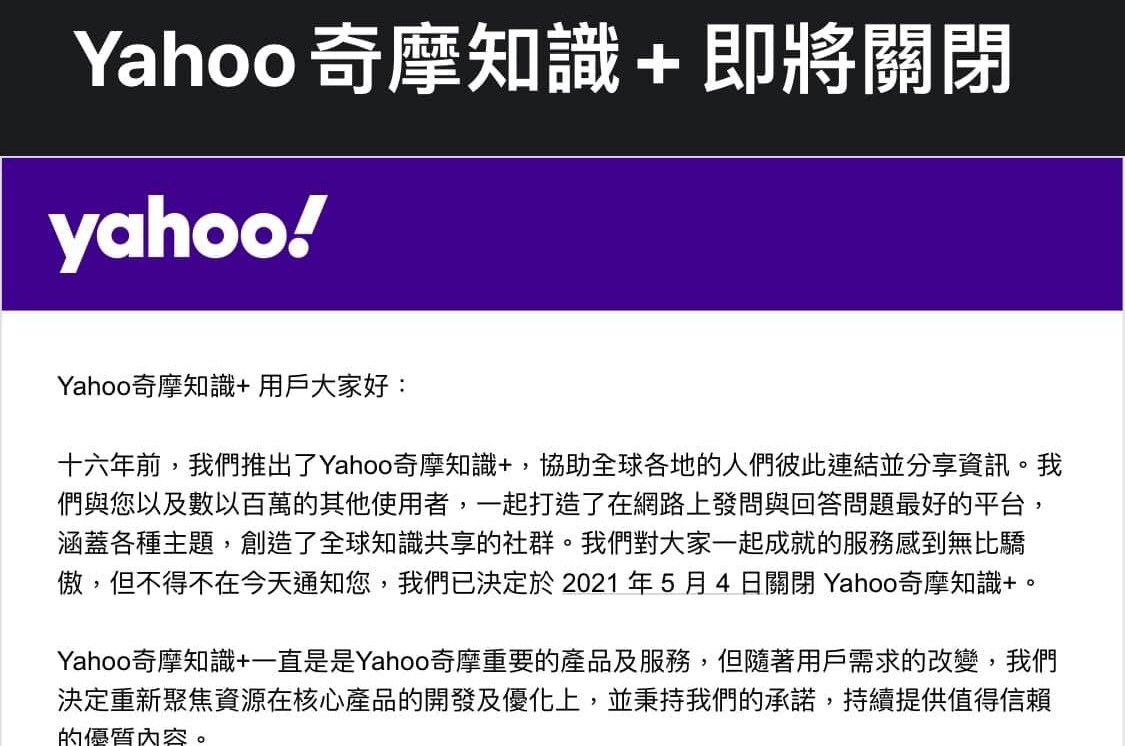 用戶4月6日開始陸續收到通知,「Yahoo奇摩知識+」官方決定關閉平台,4月20日起無法繼續在「知識+」中提出新的問題,或是回答其他使用者的問題;5月4日起無法再使用網站,如果嘗試使用,系統將會重新導向至Yahoo首頁。此更動不會對Yahoo帳戶或其他所有Yahoo奇摩服務影有影響,若日後有問題,官方則建議「請前往Yahoo奇摩搜尋」在網路上搜尋答案和資訊。