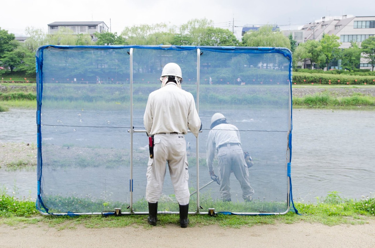 ▲日本工人割草時都是兩兩一組,一人持機器割草,另一則手持防護網避免誤傷過路民眾。(圖/翻攝自FB/ 飛鳥季アスカキ)
