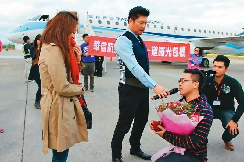 ▲吳昭輝(右2)5年前精心安排浪漫求婚,帶著當時還是女友的妻子(左)搭乘曙光專機,在停機坪單膝下跪求婚,愛情故事還登上報紙頭版。(圖/鏡週刊提供)
