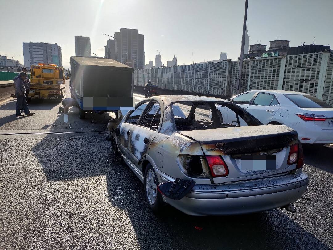 北市7日上午6時許,在市民大道上1台67歲馮姓男子所開的轎車追撞前方51歲邱姓駕駛所開的小貨車,但轎車撞上後整台車引擎蓋起火,火勢瞬間將轎車燒成火球,警消到場後緊急將車輛撲滅。