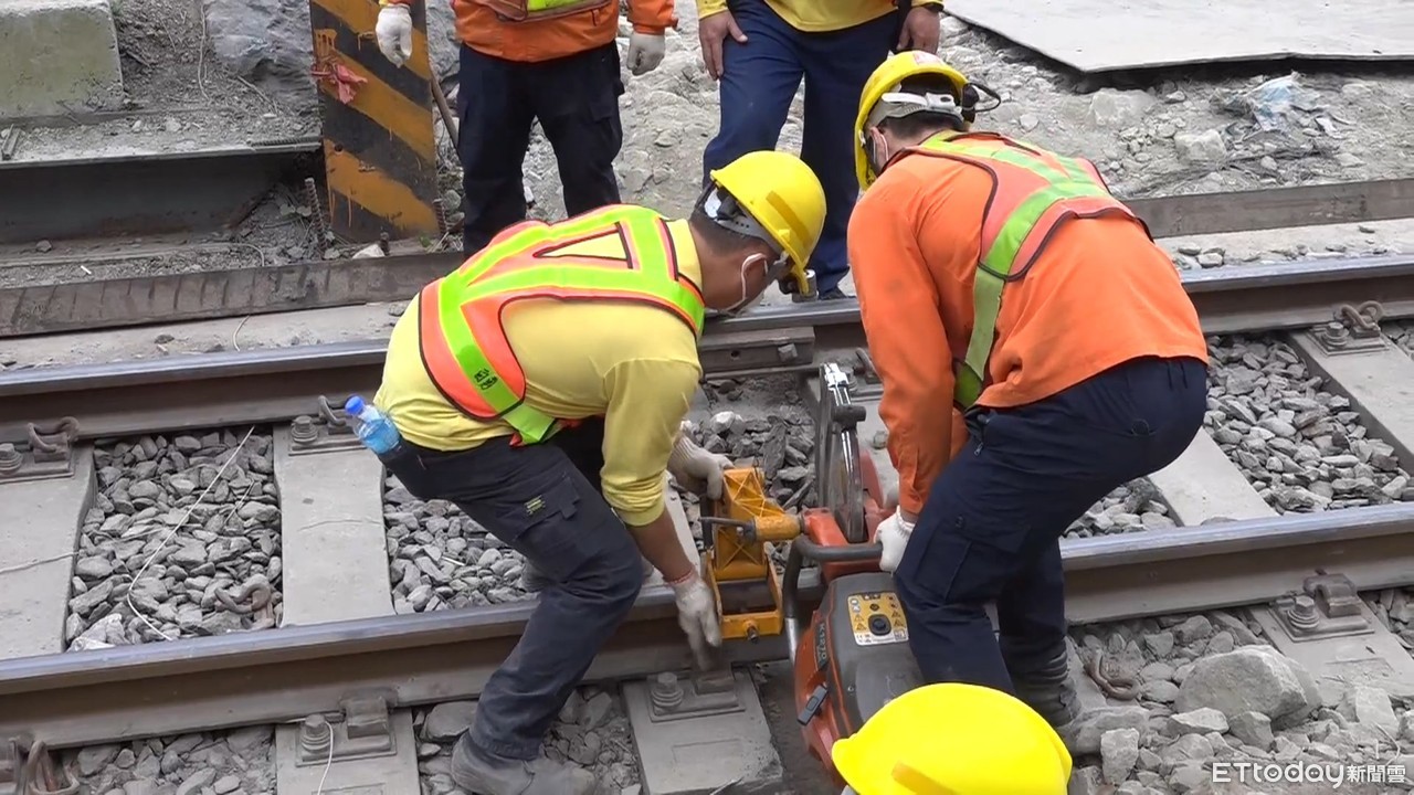 ▲台鐵太魯閣號出軌,工程人員正在清理軌道重新鋪設。(圖/記者楊詩益攝)