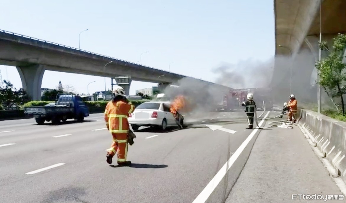 警方表示,轎車駕駛是72歲的楊姓男子,行經國一南下55.6公里處時發現車子怪怪的,曾停靠路肩檢查,但未發現異狀又繼續上路,轎車引擎突然發出巨響,隨即引擎蓋冒出濃煙與火花,他立即將停在外側車道,停妥後火勢隨即竄出,楊男趕緊下車逃生,並打電話報案。