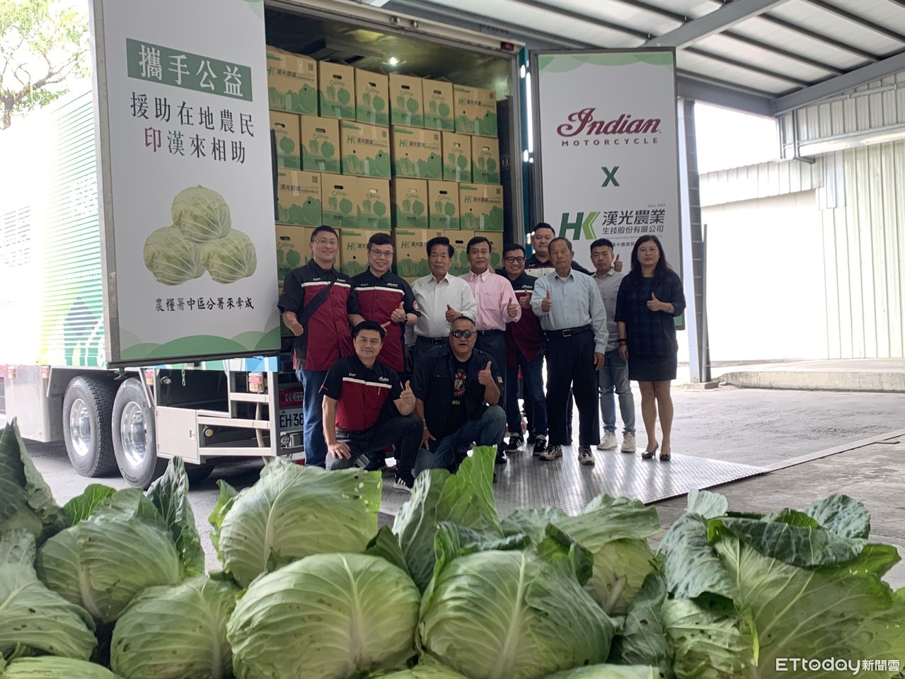 ▲今日上午在漢光生技公司舉行裝箱儀式,漢光農業&印地安重機攜手合作,認購高麗菜,協助農民過難關。 (圖/記者蔡佩旻攝)