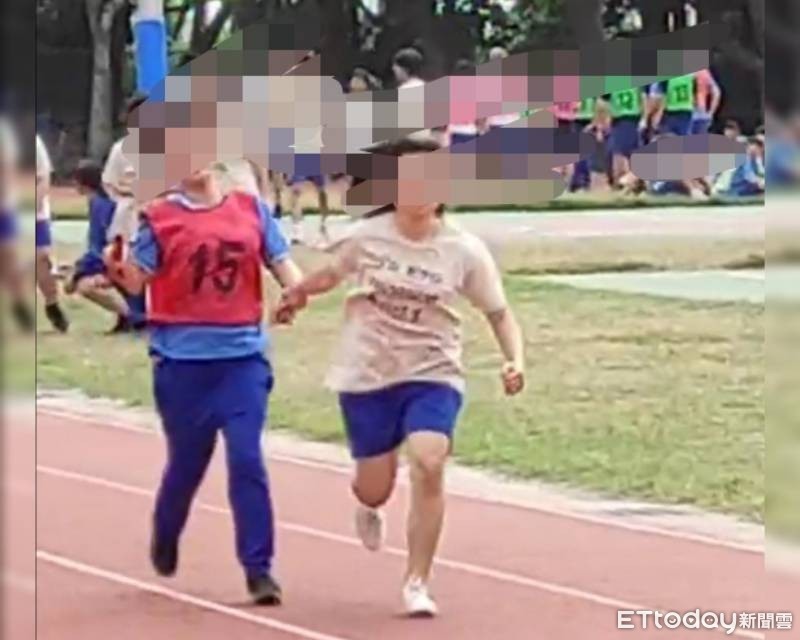 ▲雙眼視神經萎縮的柯姓女學生與同學牽手跑完全程。(圖/二林高中提供)