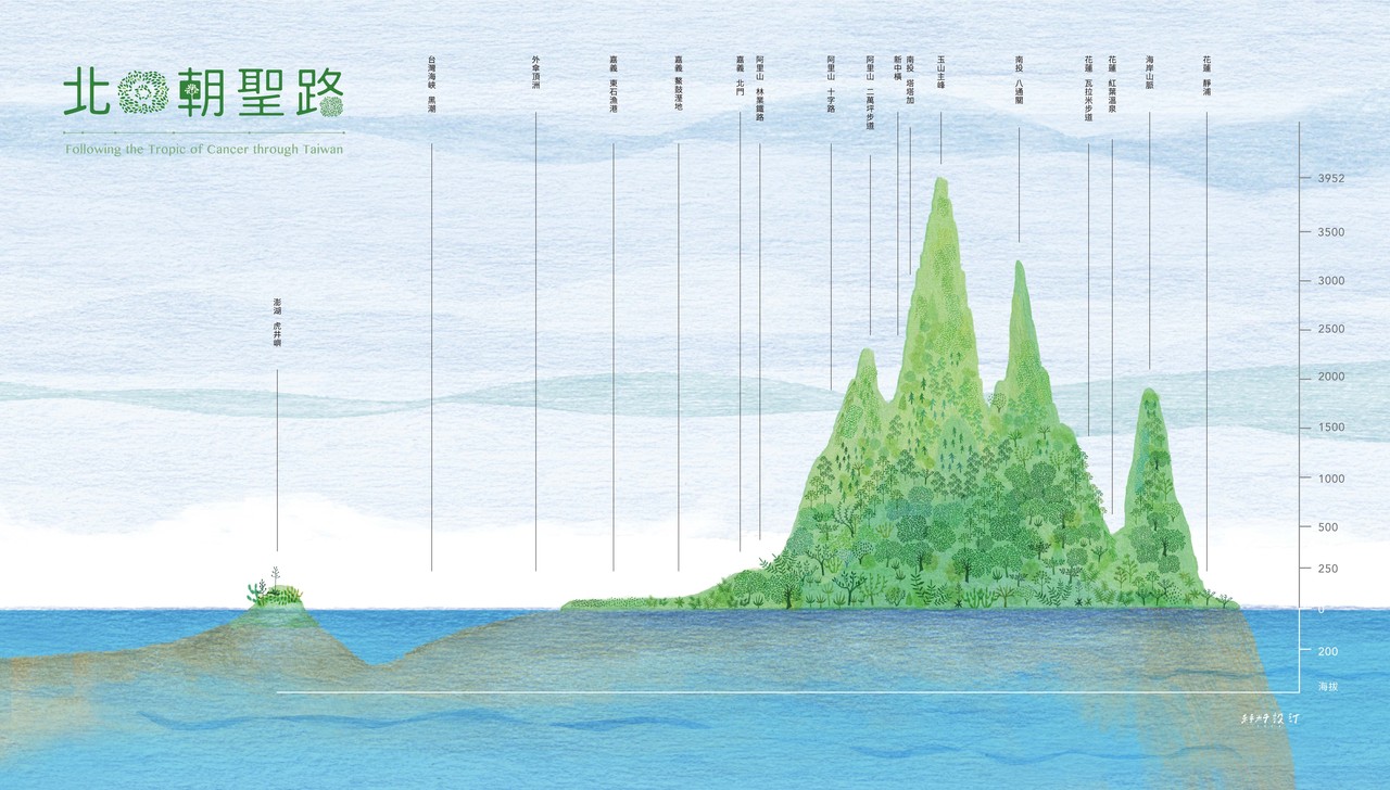 由於地球五大緯線之一的「北回歸線」沿線,多敗是乾燥的沙漠氣候,唯有台灣生態多樣、物產豐饒,因此在北回歸線穿針引線下,從澎湖虎井嶼到花蓮靜浦,跨越4大山脈,從海平面到3952公尺的玉山制高點,列舉了17處特色端點,為台灣啟動一條「向內的路」。淦克萍透露,這是一條看不見的「內在的路」,歡迎大家到今年文博會探索。