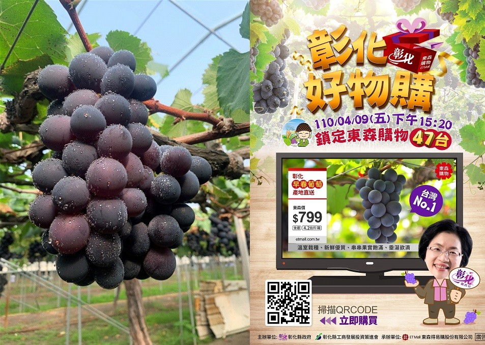 喜歡吃葡萄的民眾有福了!葡萄產季即將開始,而說到葡萄,彰化素有葡萄故鄉的美稱,彰化縣長王惠美9日將第三度親上東森購物《東森農場》LIVE節目,推廣成功外銷日本市場的「彰化溫室早春葡萄」,每箱2.5公斤,東森價僅賣799元,均由產地低溫宅送,東森購物董事長王令麟再加碼回饋50%東森幣,等於半買半相送,將於4/9(三)15:20在東森電視購物第47頻道準時開賣。