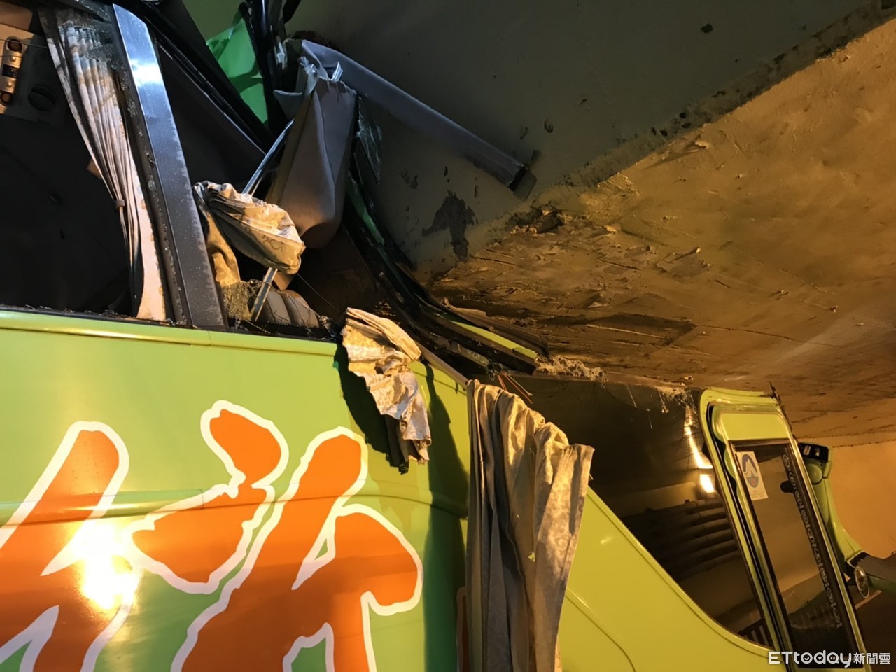 ▲1部統聯大客車8日晚誤駛台南市北區小東地下道機慢車道,大客車車頭撞上台鐵橋墩,整個車頭被「削半」卡在車道入口動彈不得,幸好無人傷亡。(圖/記者林悅翻攝,下同)
