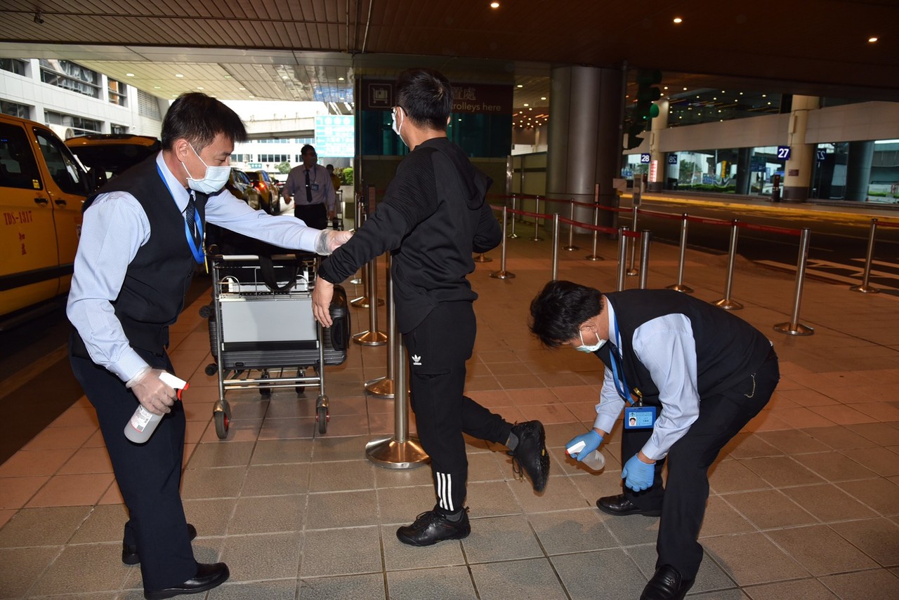 ▲入境旅客在搭乘桃園機場防疫計車前皆須先經過嚴謹的清消程序。