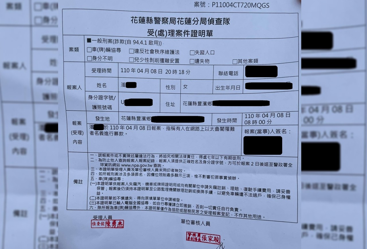 劉宇透露,法喆的大妹遇到哥哥不幸喪生已非常難過,再拿到這張報案證明單拿時,直接氣到哭出來,「明天就是法喆的告別式,家屬們真的沒有心力再去譴責宅卡啦,站在靈堂前的我不知道該如何安慰家屬但要我拿出手機發文幫家屬罵人倒是還辦的到,宅卡啦就是無恥不要臉,冒名募款超噁心!!!」