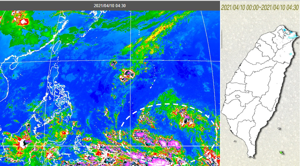 ▲今(10日)晨4:30紅外線雲圖(左圖)顯示,華南至台灣北部海面一帶有鬆散雲層,迎風面有較多的低層雲;關島南方海面(白虛圈)有熱帶雲簇消消長長,結構還很鬆散。4:30累積雨量圖(右圖)顯示,北部及東北部有零星降雨。(圖/翻攝三立準氣象· 老大洩天機)