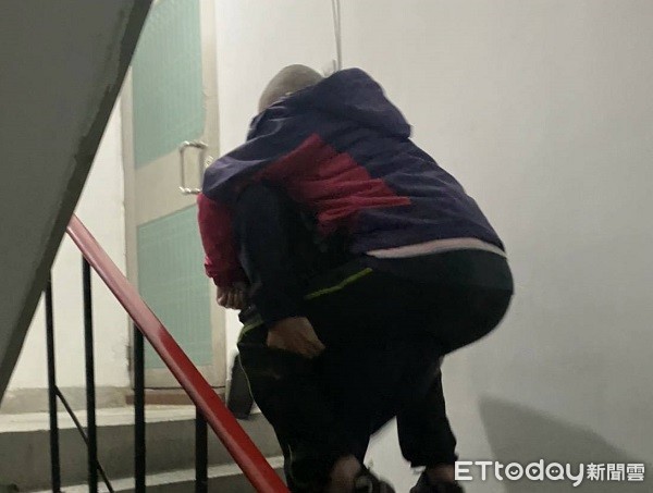 ▲員警揹起林姓男子上樓梯。(圖/桃園警分局提供)