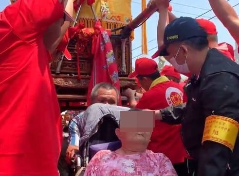 ▲轎班將神轎高高舉起,好讓輪椅阿嬤也能夠「鑽轎腳」。(圖/翻攝自鹿耳門天后宮臉書粉專)