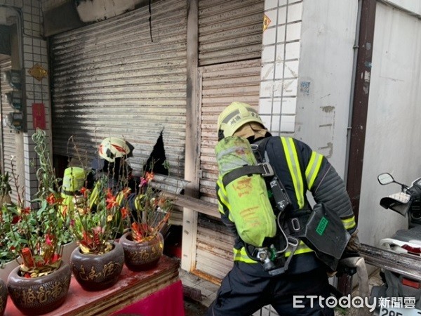 ▲消防人員用破壞工具將鐵門破壞搶救受困民眾。(圖/桃園市消防局提供)