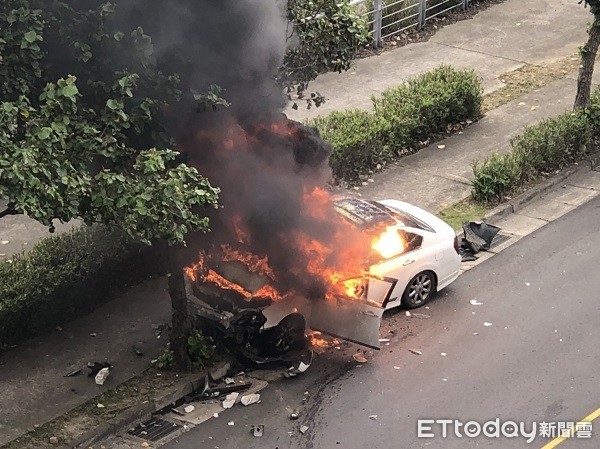桃園市政府消防局則在9時32分許接獲該起火燒車報案, 現場為1輛行駛中的白色自小客車因失控撞向路旁停放靜止的黃色自小客車輛,造成白車起火燃燒,被撞黃車噴飛10公尺到對向再撞上路邊2部停車,車輛嚴重受損,所幸3車均無人在車上,未造成傷害擴大。