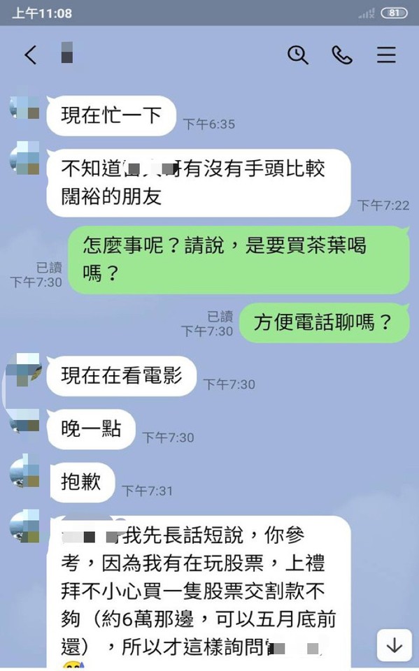 從LINE對話紀錄可見,R男於3月28日詢問鄧姓員警有無空做筆錄?對方卻在3月30日突然詢問,有沒有手頭比較闊綽的朋友?因為自己有在玩股票,上週不小心買了一支股票,交割款卻不夠,大約6萬元,要在5月底以前還,所以才詢問R男,承諾「大哥若能幫此事,我一定會還大哥人情。」