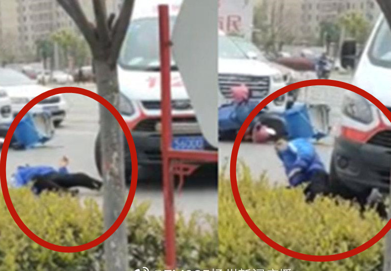 大陸微博4月12日流傳一段外送員慘遭救護車索命的影片。影片中,一名外送小哥身著藍色衣服,躺在地面上,旁邊是一輛白色小車與外送員側翻的機車與餐點箱。隨後,一名交警從旁邊走來的過程中,一輛救護車急速駛來,隨後車輪竟直接從外送員下半身輾過,原本躺著的外送員隨即痛苦坐起。