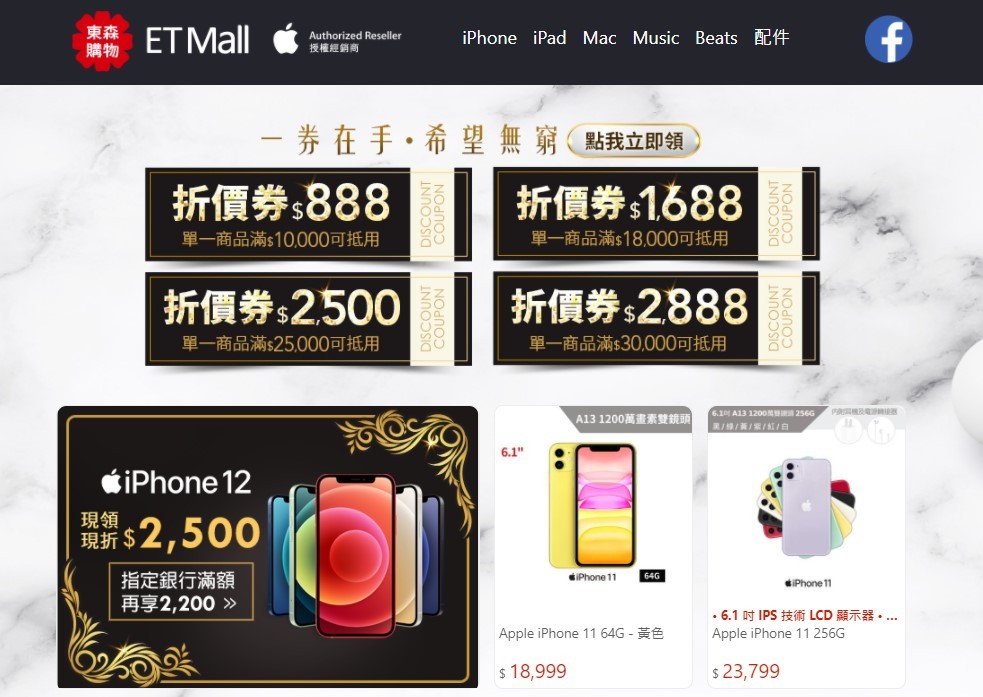 Apple快閃折扣活動從14日上午10點準時開搶,至4/16止, 活動限時3天,只要進入東森購物Etmall網站Apple旗艦館抽折價券,消費滿10,000元折888元、滿18,000元折1,688元、滿25,000元折2,500元,滿30,000元折2,888元。