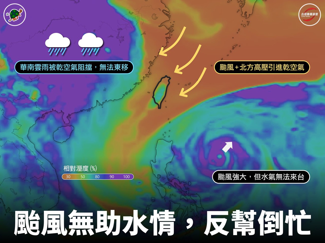 第二,由於颱風是照著逆時針環流旋轉,在生成跟行徑途中,會與北方的高壓聯手將乾空氣帶進台灣,使得台灣要下雨又難上加上難。