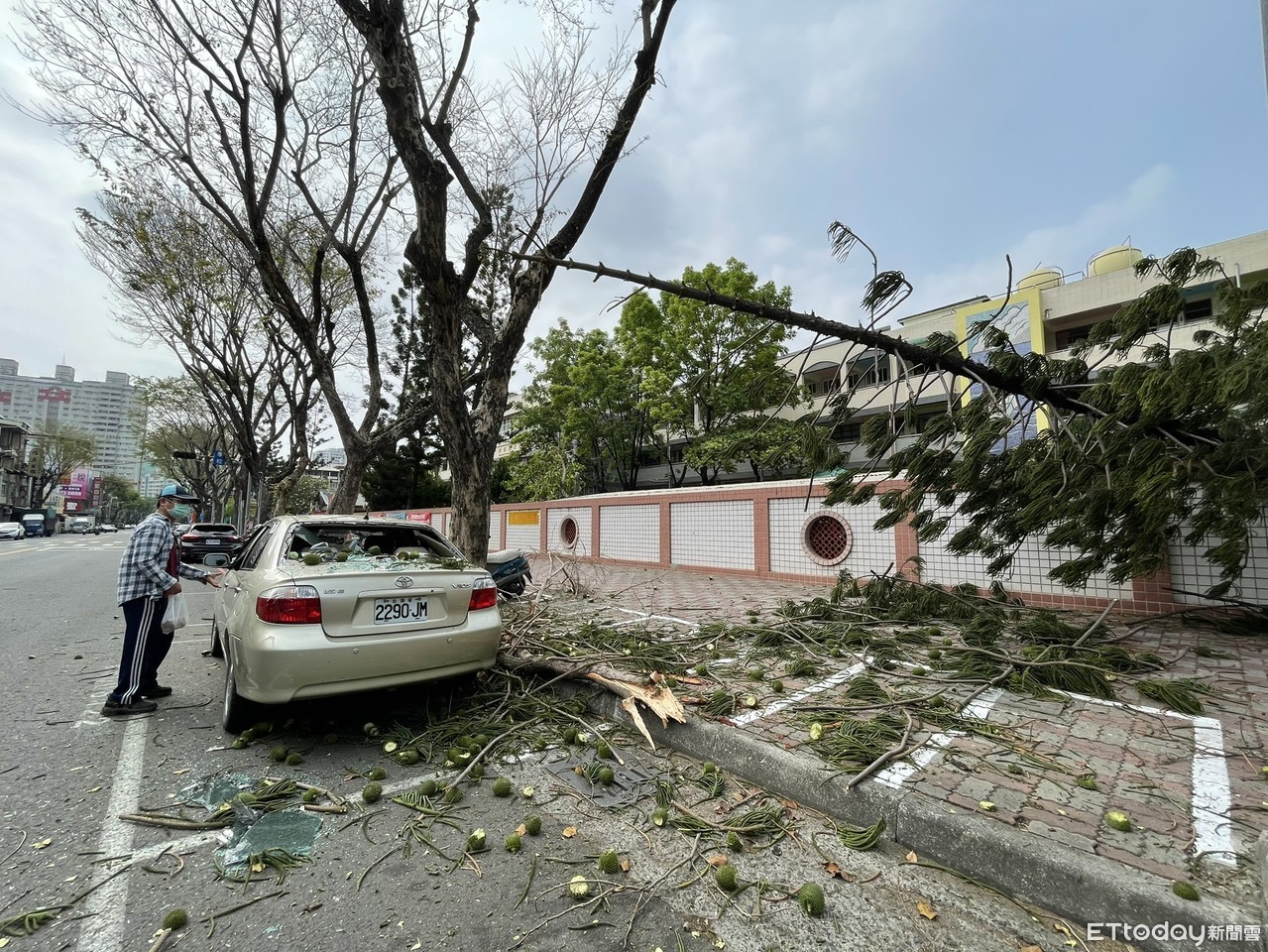 高雄市前鎮區二聖二路上一所國小,14日下午突然發生一顆樹木突然倒塌,意外壓倒一輛汽車,造成車子後擋風玻璃碎裂,所幸當時車主不在車內,也無人員受傷。