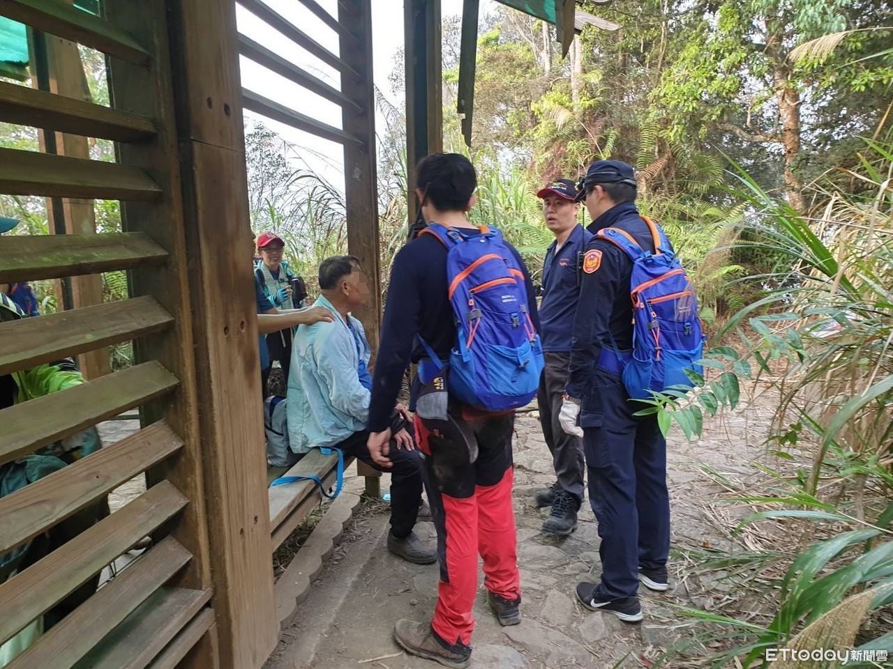 ▲7旬翁(中)獨登水社大山摔傷,警消人員花8小時才找到人送進醫院救治。(圖/民眾提供)