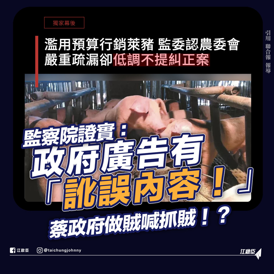 江啟臣說,反觀,政府使用公帑登載錯假訊息,遺憾監察院不對農委會提出糾正,還完全沒有任何的懲處,「只准州官放火,不許百姓點燈」的作法與專制獨裁的政府有何不同?「政府做賊喊抓賊」。