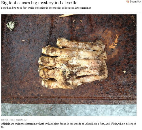 美國麻州昆西市(Quincy)2名男童3月29日在樹林裡玩,發現一個已經腐爛的腳掌,立刻報警處理,離奇的是,法醫勘驗後,指出並非人類的殘肢,但尚不能確定是什麼生物的腳掌。