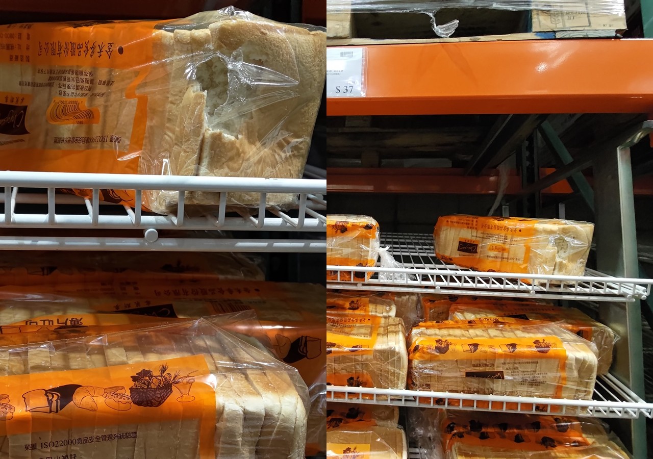 照片中可以看見,好市多商品架上放了許多條吐司,其中一條吐司的塑膠包裝破了一個大洞,不過究竟是「被咬開」還是「被扯開」則無法分辨,包裝內的吐司更是被挖空了一小塊。原PO看了就說「這個……似乎是齧齒動物(老鼠)的傑作,囧」。