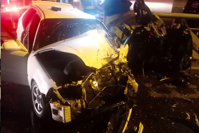 16日凌晨1點13分左右,台中大里區消防隊獲報,在74號中彰快速道路匝道前,發生兩輛轎車衝撞意外,駕駛皆受困駕駛座,消防人員獲報前往救援,只見其中肇事車輛因猛烈衝撞,瞬間崩解成2塊,而另一輛轎車也潰縮成一團廢鐵。