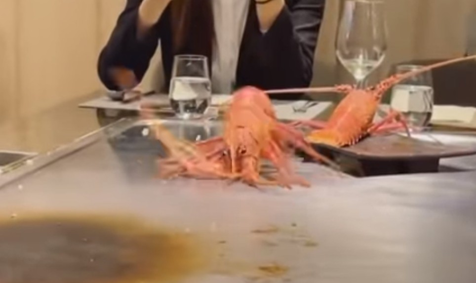影片中可見,龍蝦在鐵板上先是激動地不斷跳動、掙扎,到最後身體開始冒煙,漸漸不再移動。
