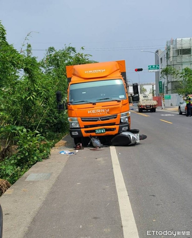 ▲嘉義保忠一街大貨車與機車相撞,機車卡在前保桿下。(圖/讀者提供)