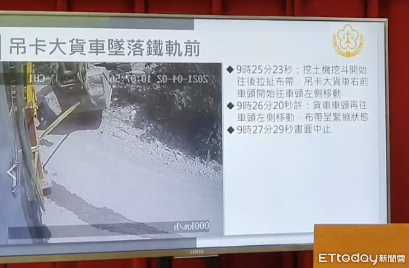 接著9時25分23秒時,挖土機的挖斗開始往後拉扯布帶,而吊卡大貨車右前車頭開始車頭左側移動,9時26分20秒時,貨車車頭再度往左側移動,而這時布帶早已呈現緊繃狀態,一直到9時27分29秒,畫面就此停止,短短的2分06秒的時間,也成了太魯閣號撞擊工程車出軌後的致命關鍵。