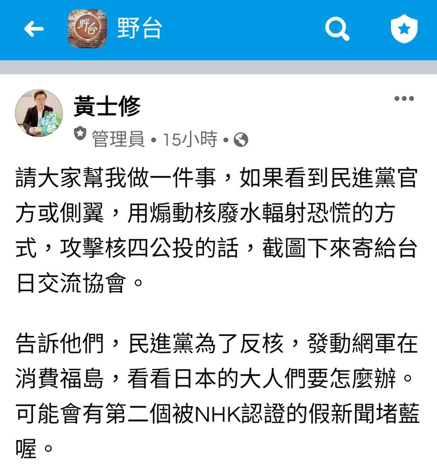日本政府日前拍板福島核廢水排入海中,國民黨日前召開記者會對外公開批評日本,而重啟核四公投領銜人黃士修則在名為「野台」的公開網路群組發文,為日本排核廢水辯護。