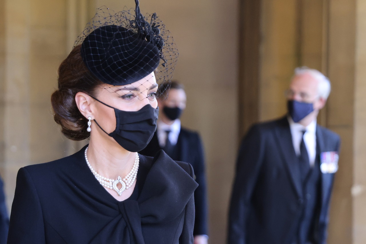 英國菲利普親王(Prince Philip)17日舉辦葬禮,有媒體發現威廉王子與凱特王妃抵達溫莎堡時,凱特王妃除了全身黑衣、黑帽以外,還佩戴了女王傳給她的四層珍珠項鍊及耳環,被認為是用「女王牌」向親王致敬。