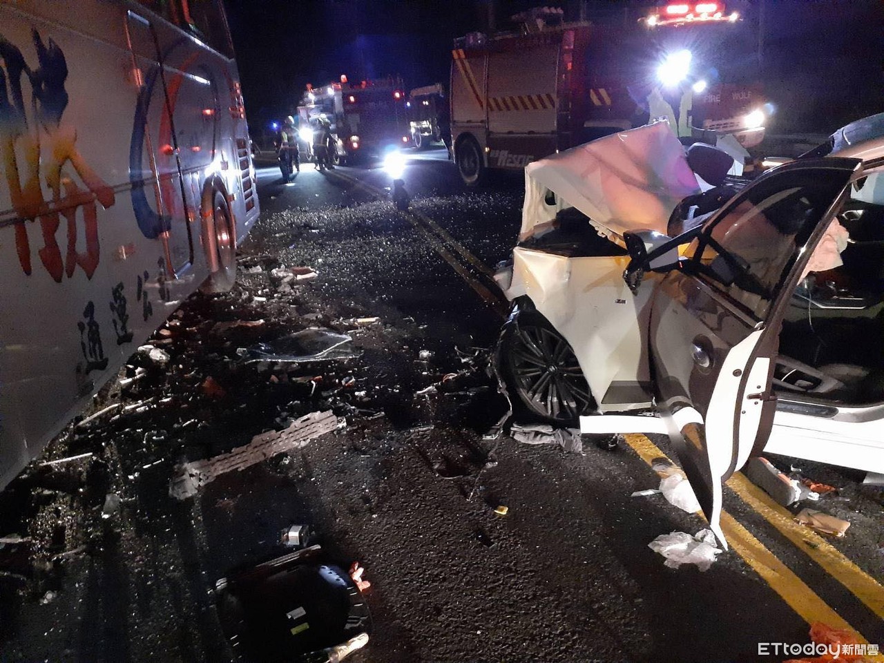 白色BMW轎車車頭毀損嚴重,零件碎片噴散一地,遊覽車擋風玻璃則因撞擊碎成蜘蛛網狀。23歲黃姓轎車駕駛當場失去生命跡象,送醫後宣告不治,另外3名20多歲的乘客均受傷,但未有生命威脅,且意識都相當清楚,已送院治療,40歲的許姓遊覽車駕駛則是右小腿撕裂傷,車上僅司機1人,無其他乘客。