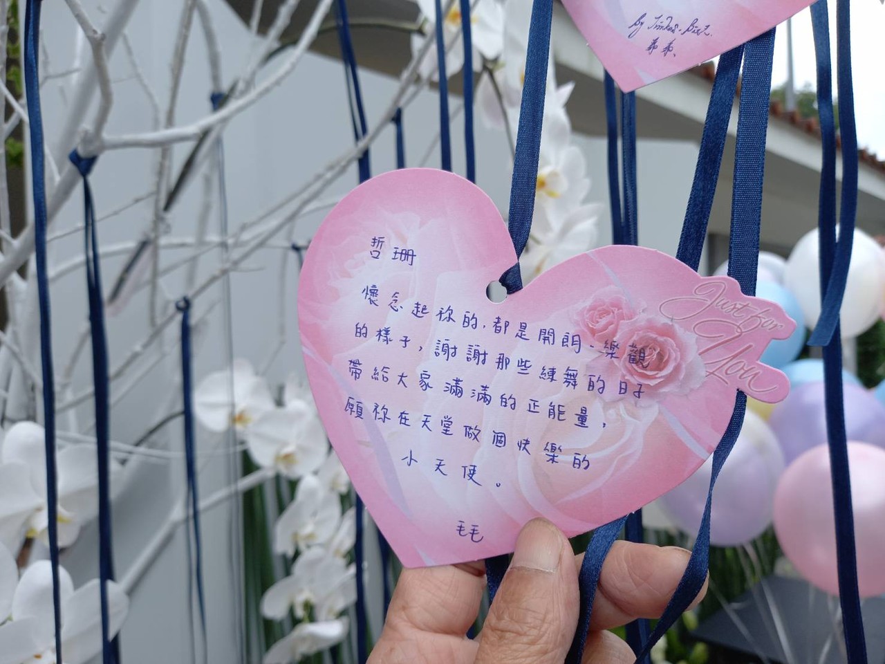 ▲太魯閣號出軌罹難者蔡哲珊19日告別式中,她同學們繫卡片要她做天堂快樂小天使。(圖/讀者提供,下同)