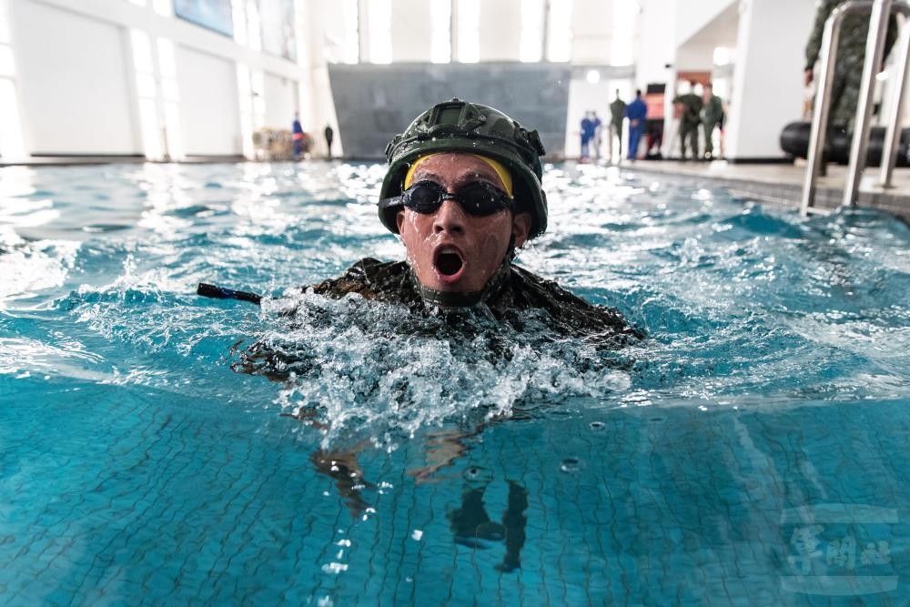 上午金門天氣仍有寒意,這群挺過嚴寒冬天的小蝌蚪們無畏低溫,進行200公尺武裝蛙泳及33公尺平潛測驗。他們必須全副武裝,大背槍在7分半內完200公尺蛙泳;完成後經過短暫呼吸調節,隨後再進行緊貼池底、一口氣潛泳33公尺才能過關,十分考驗學員們的水性與體能。