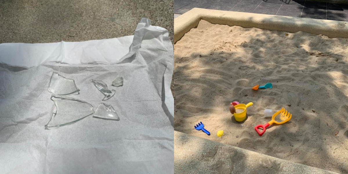 ▲沙堆竟有尖銳玻璃,一旦孩子被刮傷,後果不堪設想!(圖/翻攝新竹大小事)