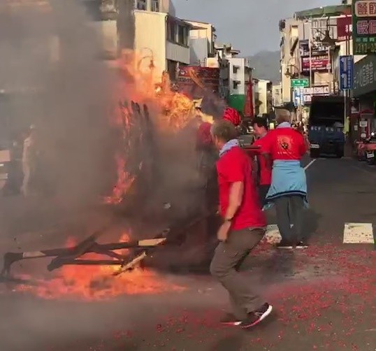 ▲台中建國市場聖母宮進香大發爐,神明沒事轎班灼傷。(圖/翻自記者爆料網)