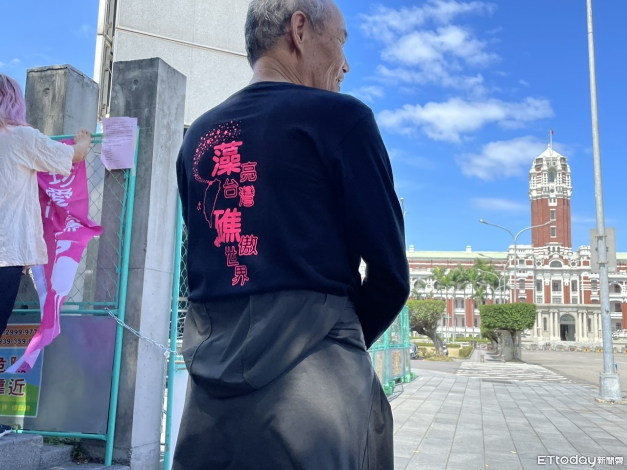 ▲潘忠政說,特別做了身上穿的T恤要送給蔡英文。(圖/記者許展溢攝,下同)