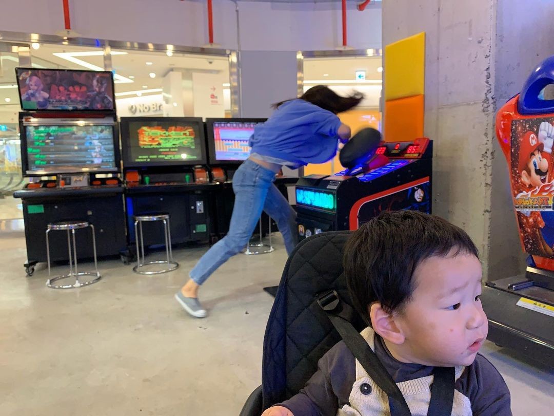 本來媽媽穿著藍色上衣揮拳,因打得太賣力全身發熱,便直接脫掉,穿著灰色短袖繼續發洩,不只玩了揮拳機,還玩了用槌子敲擊的機台,後來還騎機車飆車,玩了腳踩箭頭的音樂機台,小孩則坐上嬰兒車上東張西望,還無聊到吃起手手,跟後面的媽媽形成超強對比。