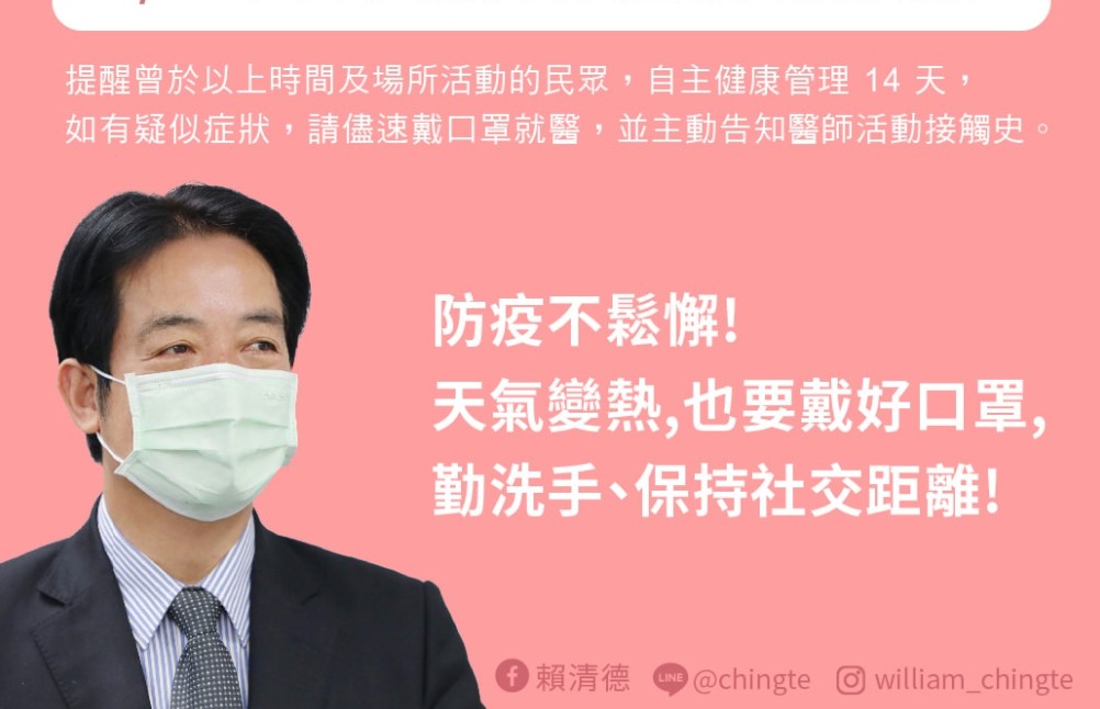 ▲賴清德喊話不能對疫情掉以輕心。(圖/翻攝自Facebook/賴清德)