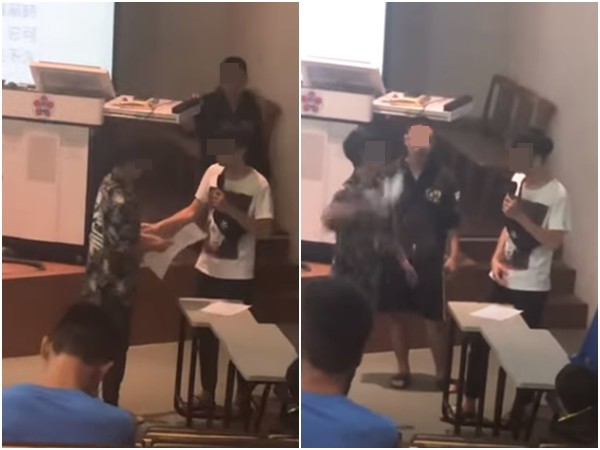 「X你X咧!」男大生突然暴走,將考卷揉成一團後丟到助教身上,瀟灑地轉身快步離開考場,讓許多考試到一半的學生抬頭觀看,而助教也用麥克風安撫同學說「繼續考試」。