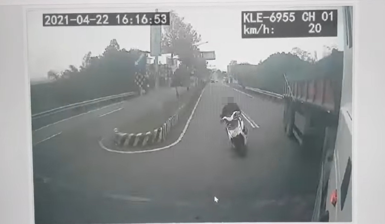 行車紀錄器畫面顯示,砂石車當時靠右側車道準備往左大迴轉,不料後方一輛機車騎士閃避不及直接撞上,車頭當場遭左前輪輾爆,騎士也倒臥車邊。警方對砂石車駕駛進行酒測,發現結果為零,詳細事故原因及責任仍待調查。