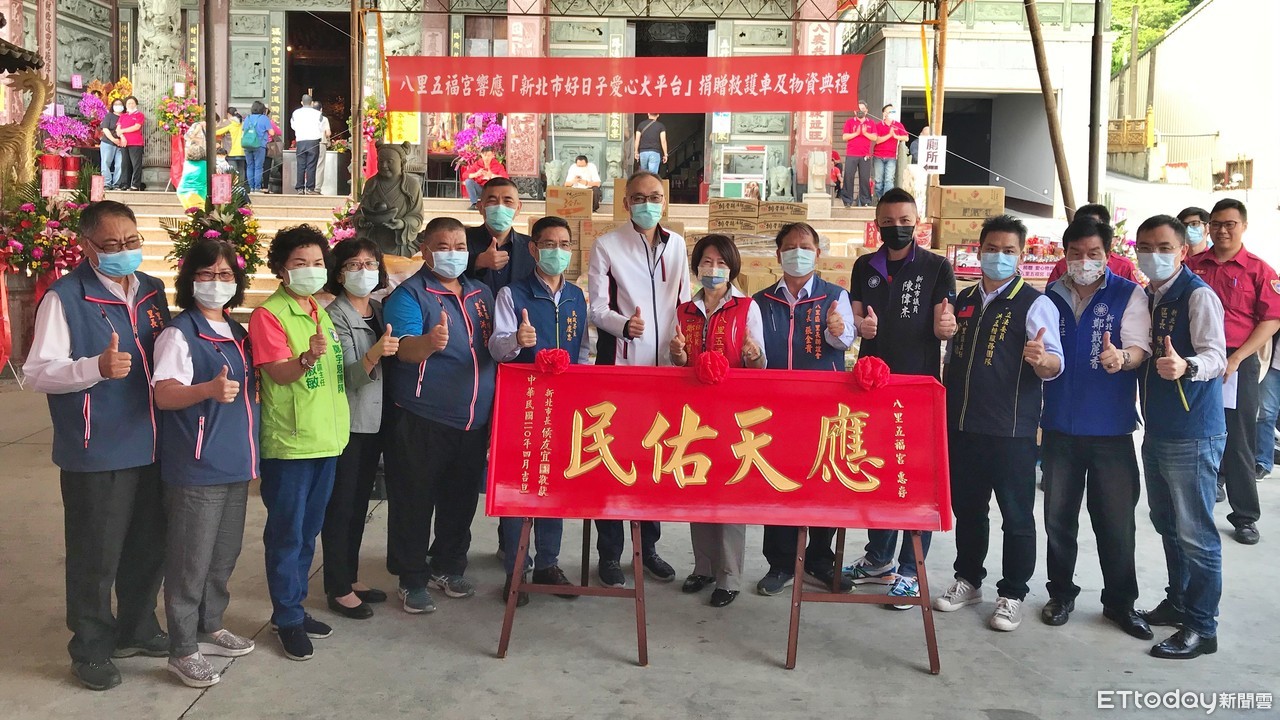 ▲八里五福宮五路武財神聖誕,捐贈救護車及愛心物資。(圖/新北市民政局提供,下同)